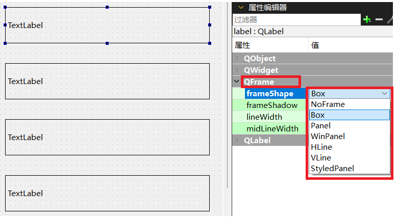 在 QLabel 里,我们还能给标签设置边框,直接在 Qt 的 ui 界面操作 QFrame 就行,因为 QFrame 是 QLabel 的父类。其中 frameShape 这个属性是用来设置边框样式的,具体的边框属性有这些: