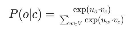 是上下文词o与中心词c的向量点积(衡量关联强度),softmax 函数将点积归一化为概率。
