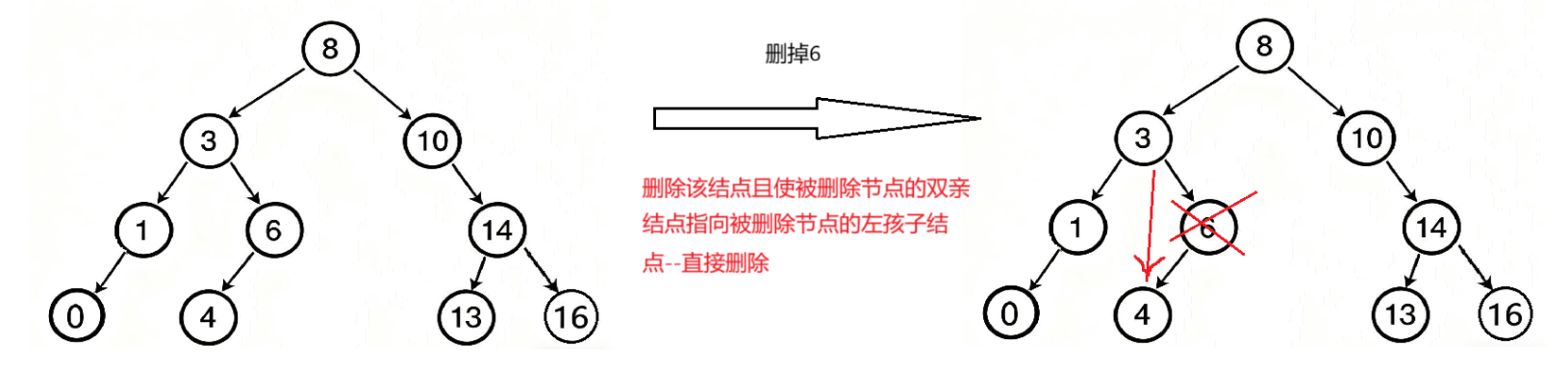 删除该结点且使被删除节点的双亲结点指向被删除节点的左孩子结点--直接删除