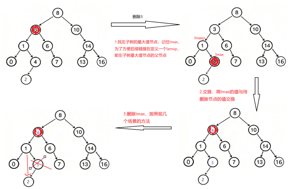 解决方案:替换法(博主选择 “左子树最大值节点” 作为替换节点,也可选择 “右子树最小值节点”):