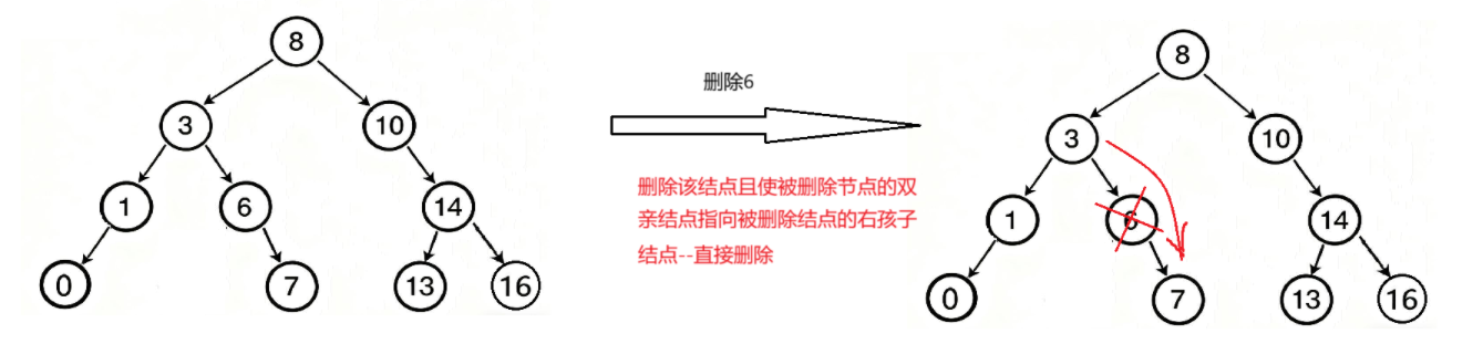 删除该结点且使被删除节点的双亲结点指向被删除结点的右孩子结点--直接删除