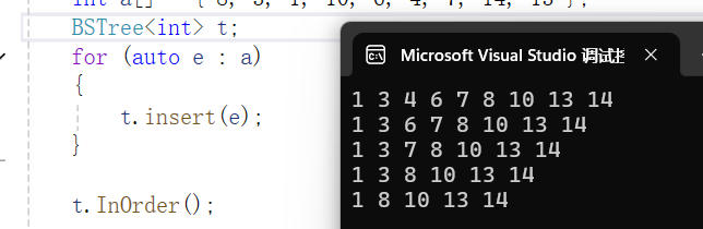 {int a[] = { 8, 3, 1, 10, 6, 4, 7, 14, 13 };BSTree<int> t;for (auto e : a){t.insert(e);}t.InOrder();t.erase(4);t.InOrder();t.erase(6);t.InOrder();t.erase(7);t.InOrder();t.erase(3);t.InOrder();for (auto e : a){t.erase(e);}t.InOrder();