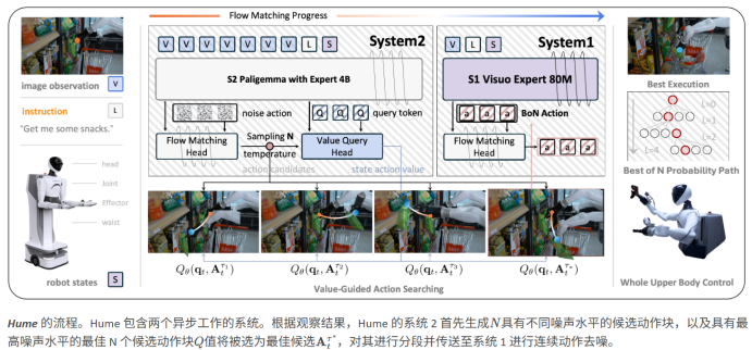 双系统架构设计:系统2作为 “慢思考” 核心,基于40亿参数的视觉语言模型构建,通过价值查询头估计动作的状态 - 动作价值,重复采样并筛选最优动作块;系统1作为轻量级 “快执行” 模块,以8000万参数实现90赫兹高频动作输出,对系统2的动作进行级联去噪。