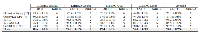 表1:LIBERO基准测试结果。展示了每种方法在四个任务套件中的成功率(SR)和标准误差,这些结果是在三个随机种子下进行500次试验的平均值。Hume取得了最高的平均成功率和排名,其次是OpenVLA-OFT和π0。