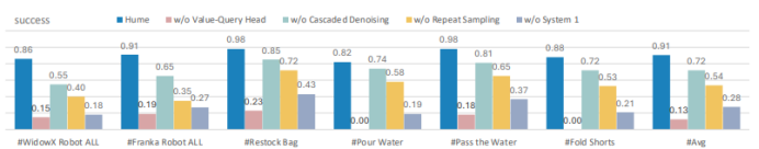 在WidowX、Franka和Agibot G-1机器人上的实际消融实验。在3个不同的实际机器人平台上对Hume进行了消融研究,涵盖15个机器人学习场景和21个实际操作任务。