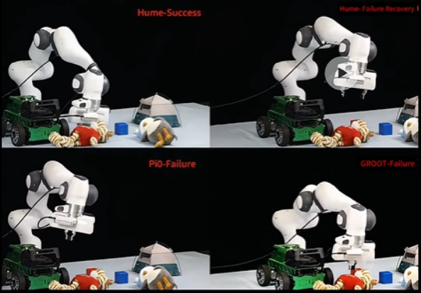 Hume 模型通过双系统架构与价值引导思维,为机器人赋予了类人化的 “思考” 能力,在 Franka Research 3 机器人上的实验验证了其在复杂场景中的优越性。