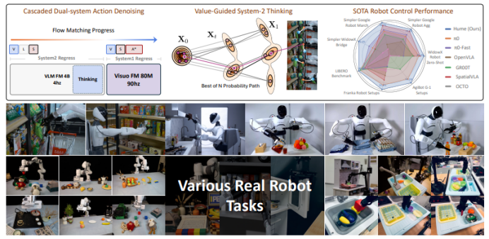 Hume,这是一种双系统视觉语言行动模型,旨在探索类人思维能力,以实现灵巧的机器人控制。该模型配备了价值导向的系统2思维和级联行动去噪功能,具备卓越的复杂推理和控制能力。该模型在各种评估中均达到了最先进的性能,并展现出 在复杂机器人控制任务方面取得了显著进展。