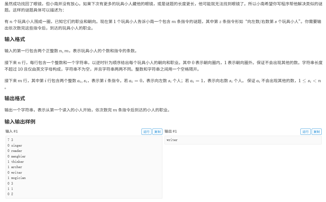 int main(){int n,m;cin>>n>>m;int a[n]; //0代表朝内 1朝外 string s[n];for(int i=0;i<n;i++){cin>>a[i]>>s[i];//输入数据 }//逆时针保存的数据//朝里左边 往小的//朝里右边 往大的//朝外左边 往大的//朝外右边 往小的//从第一个人开始处理int index=0;//下标 for(int i=1;i<=m;i++){int p,p1;cin>>p>>p1;//0代表左边 1代表右边if(a[index]==0&&p==1||a[index]==1&&p==0){index=(index+p1)%n;}else{int number=index-p1;if(number<0) index=n+number;else index=number;} } cout<<s[index];return 0;