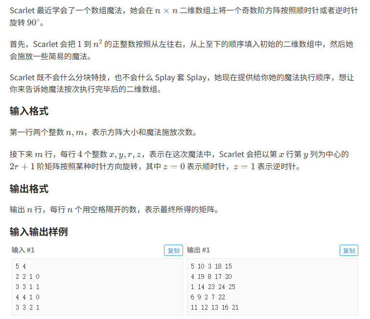 int main(){cin>>n>>m;init();while(m--){cin>>x>>y>>r>>z;z?ni_90():shun_90(); } for(int i=1;i<=n;i++){ //输出数据for(int j=1;j<=n;j++){cout<<arr[i][j]<<" ";}cout<<endl;}return 0;