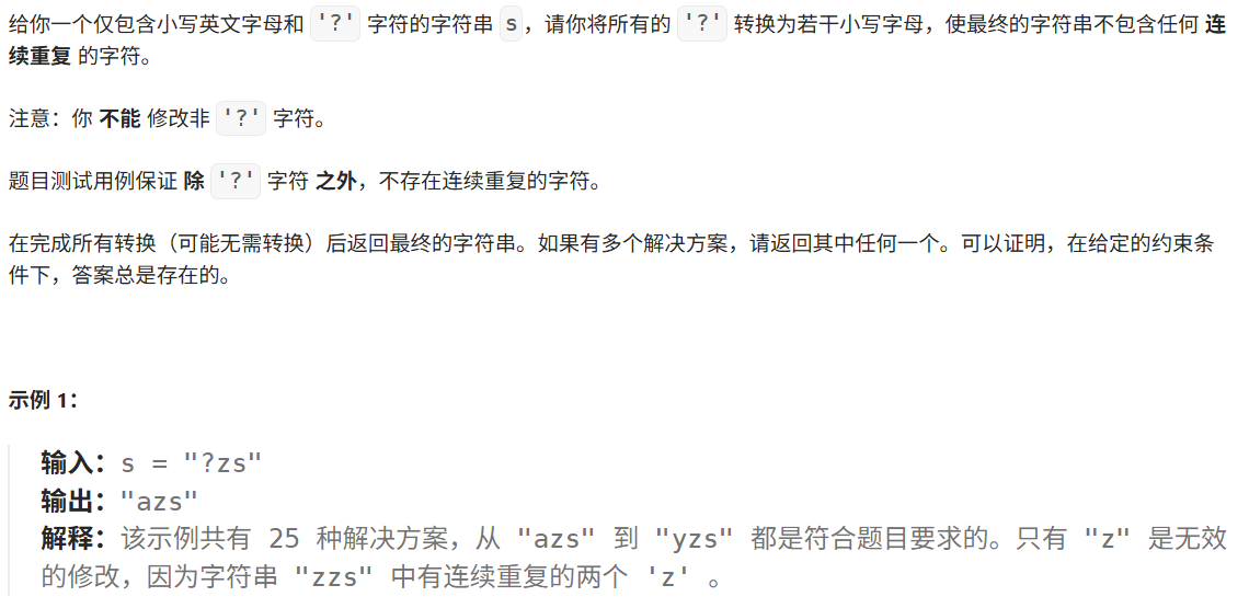 题目的意识是:给出仅有小写英文字母和?的字符串 ,将?转换成小写字母 最后使得字符串不含重复的字符 ,保证除?外的字符不重复,不能修改非?字符