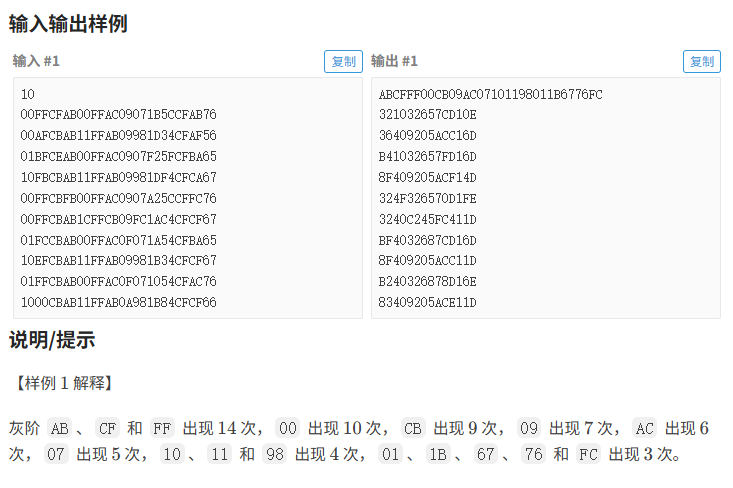 } int main(){int n;cin>>n;int data;for(int i=1;i<=n;i++){cin>>ss[i];//读取字符串for(int j=0;j<ss[i].size();j+=2){string str="";//读取16进制数str+=ss[i][j];str+=ss[i][j+1];data=T_16_10(str);arr[data].s=str;//将16进制保存 arr[data].data=data;//存入10进制 arr[data].number++;//个数+1 } }sort(arr,arr+256,cmp);//排序 for(int i=0;i<16;i++) cout<<arr[i].s;cout<<endl;//开始匹配for(int i=1;i<=n;i++){for(int j=0;j<ss[i].size();j+=2){string str="";str+=ss[i][j];str+=ss[i][j+1];data=T_16_10(str);int min_num=9000;//获取最小的绝对值int index=-1;//获取数据的位置for(int k=0;k<16;k++){ //与16个灰阶比较绝对值大小if(abs(data-arr[k].data)<min_num){min_num=abs(data-arr[k].data);index=k;}}switch(index){ //将位置转换为16进制表示case 15: cout<<"F";break;case 14: cout<<"E";break;case 13: cout<<"D";break;case 12: cout<<"C";break;case 11: cout<<"B";break;case 10: cout<<"A";break;default: cout<<index;break;}} cout<<endl;} return 0;