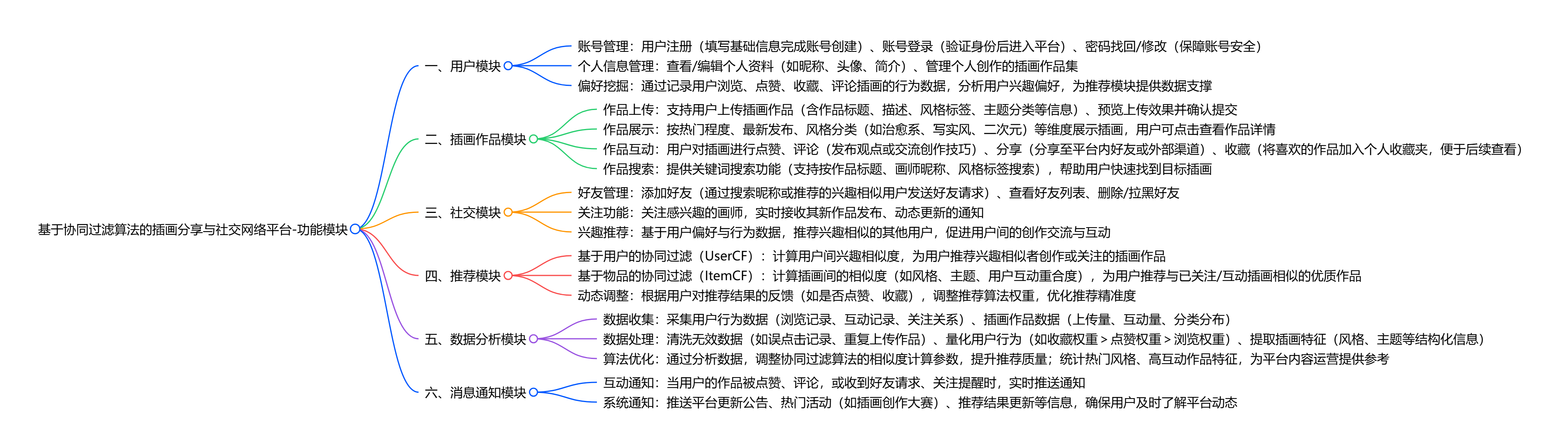 系统核心是解决传统插画创作孤立、用户找图低效的问题,功能围绕 “创作 - 分享 - 社交 - 个性化推荐” 展开: