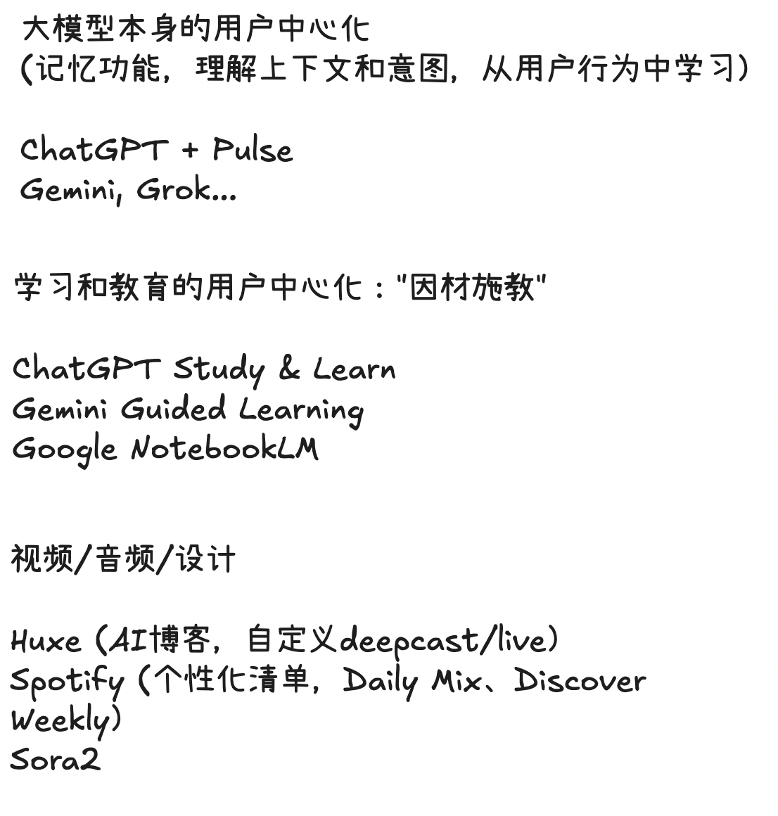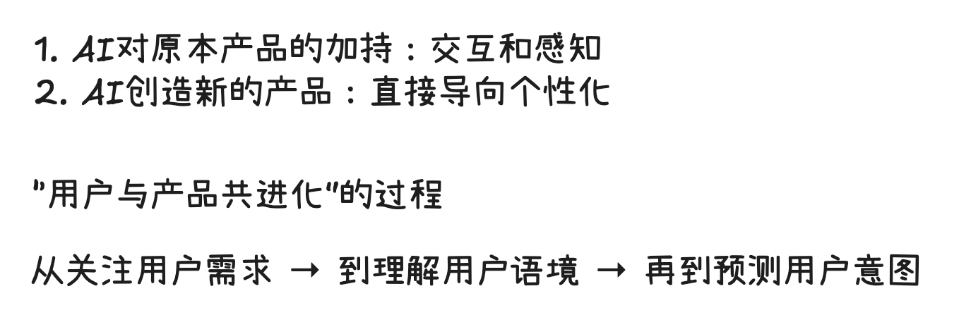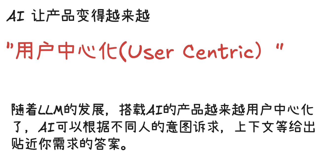 AI让用户深度参与产品过程中,跟产品一同进化。用户越来越会提需求,写Prompt,产品也越来越懂用户。从关注用户需求 到理解用户语境再到预测用户意图,AI都在让产品更加用户中心化。