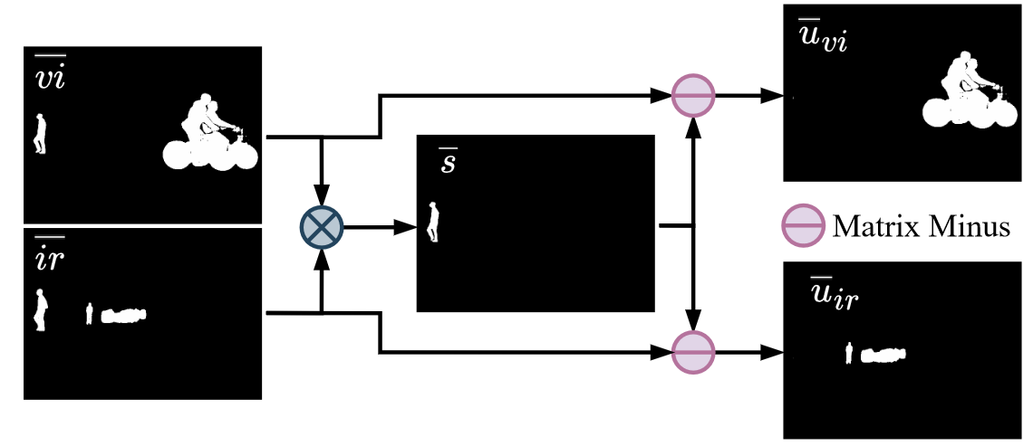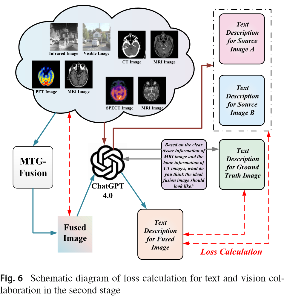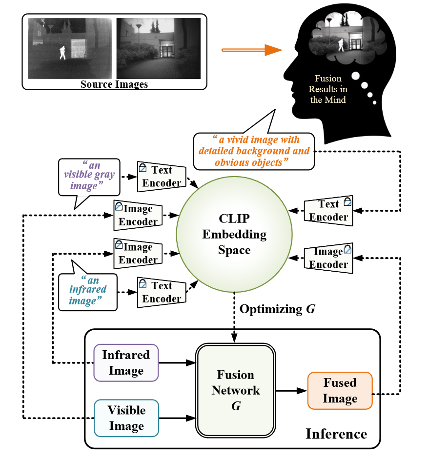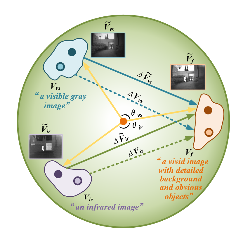 使用CLIP对可见光/红外/融合图像以及它们对应的文本进行编码,计算编码后的可见光/红外特征和融合特征差值,最小化text vector和image vector差值之间的距离: