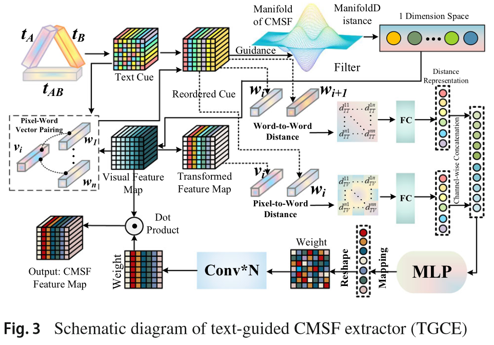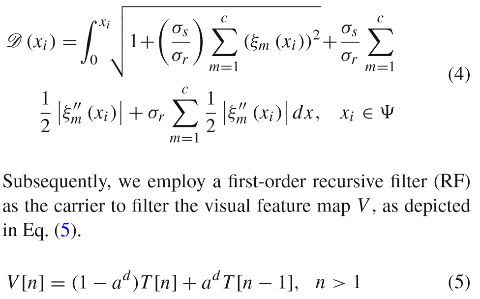 首先计算文本特征中相邻向量的距离d,d反映了语义相似度,相似度越高,距离d越小。a∈(0,1)为前馈系数,d越大,当前特征受前一位置的影响越小。在语义差异大的区域(如物体边缘),保留更多原始视觉特征;在语义相似区域(如平滑背景),增强特征一致性。