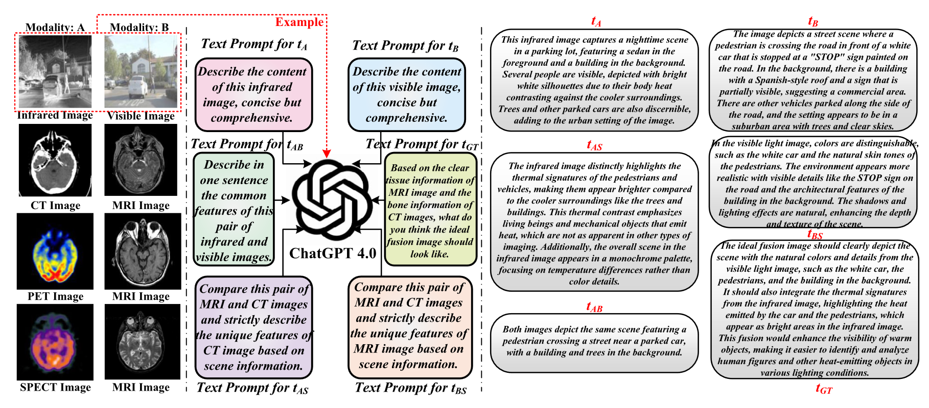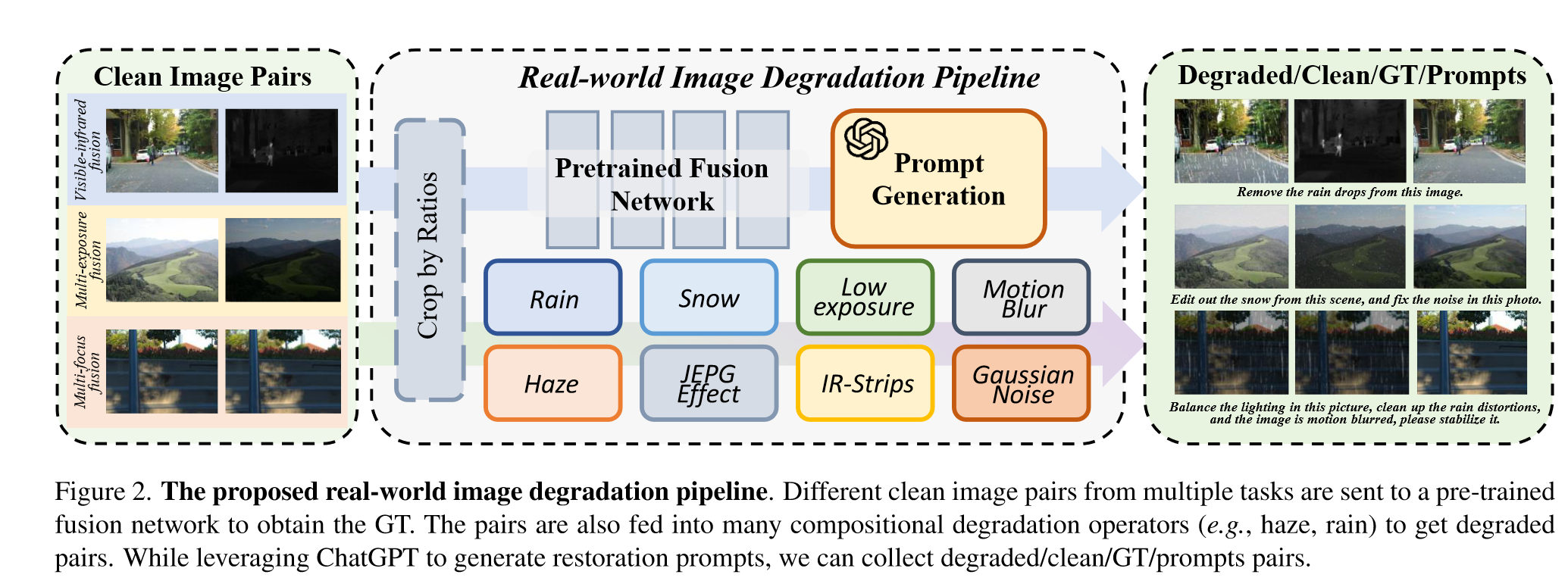 Prompt pairs:使用chatgpt为每种degradation生成10至20个提示(e.g., “please remove the noise of the image pairs”),这些提示经过编码,然后在训练期间输入网络,以指导图像恢复和融合。