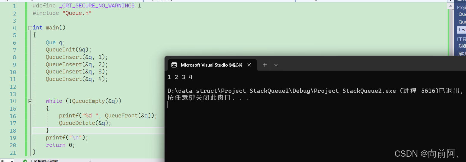 {Que q;QueueInit(&q);QueueInsert(&q, 1);QueueInsert(&q, 2);QueueInsert(&q, 3);QueueInsert(&q, 4);while (!QueueEmpty(&q)){printf("%d ", QueueFront(&q));QueueDelete(&q);}printf("\n");return 0;