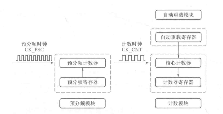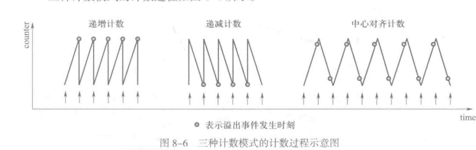 定时器的计数模块支持三种计数模式:递增计数、递减计数和中心对齐计数,并产生溢出事件,作为定时器的更新中断(定时中断)。