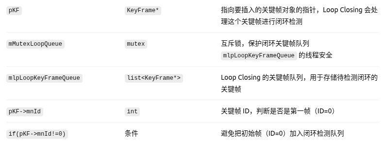 void LoopClosing::InsertKeyFrame(KeyFrame *pKF) {unique_lock<mutex> lock(mMutexLoopQueue);if(pKF->mnId!=0)mlpLoopKeyFrameQueue.push_back(pKF); }