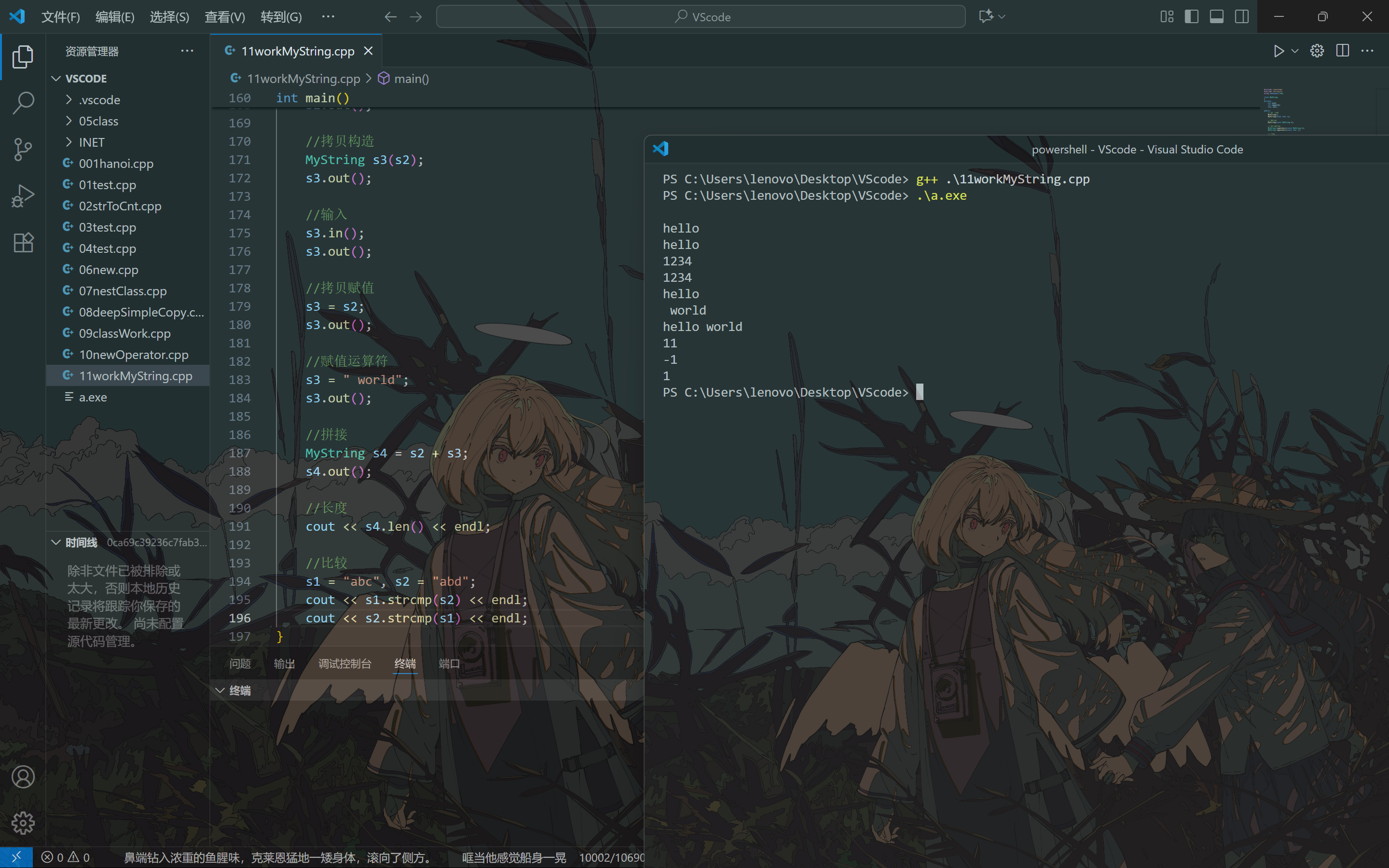{//无参构造 MyString s1;s1.out();//有参构造MyString s2("hello");s2.out();//拷贝构造MyString s3(s2);s3.out();//输入s3.in();s3.out();//拷贝赋值s3 = s2;s3.out();//赋值运算符s3 = " world";s3.out();//拼接MyString s4 = s2 + s3;s4.out();//长度cout << s4.len() << endl;//比较s1 = "abc", s2 = "abd";cout << s1.strcmp(s2) << endl;cout << s2.strcmp(s1) << endl;