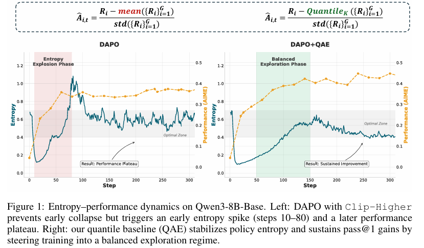 摘要:可验证奖励的强化学习(Reinforcement Learning with Verifiable Rewards, RLVR)虽能增强大语言模型(LLM)的推理能力,但其训练过程常在熵崩溃与熵爆炸两种极端状态间振荡。我们追溯发现,这两种风险均源于无价值函数强化学习(如GRPO和DAPO)中采用的均值基线方法——该方法在奖励异常值情况下会对负优势样本施加不当惩罚。为此,我们提出分位数优势估计(Quantile Advantage Estimation, QAE),以组级K分位数基线替代均值基线。QAE构建了响应层面的双模式门控机制:对于困难查询(概率p ≤ 1 - K),强化罕见成功案例;对于简单查询(概率p > 1 - K),则聚焦剩余失败案例。通过一阶softmax更新,我们证明了QAE具有双边熵安全性,即对单步熵变化给出上下界约束,从而抑制熵爆炸并防止熵崩溃。实证表明,这一微小改进即可稳定熵值、稀疏化信用分配(在调整K值后,约80%的响应获得零优势),并在AIME 2024/2025和AMC 2023基准测试中持续提升Qwen3-8B/14B-Base模型的pass@1指标。这些结果揭示,相较于词元级启发式方法,基线设计才是扩展RLVR性能的核心机制。Huggingface链接:Paper page,论文链接:2509.22611
