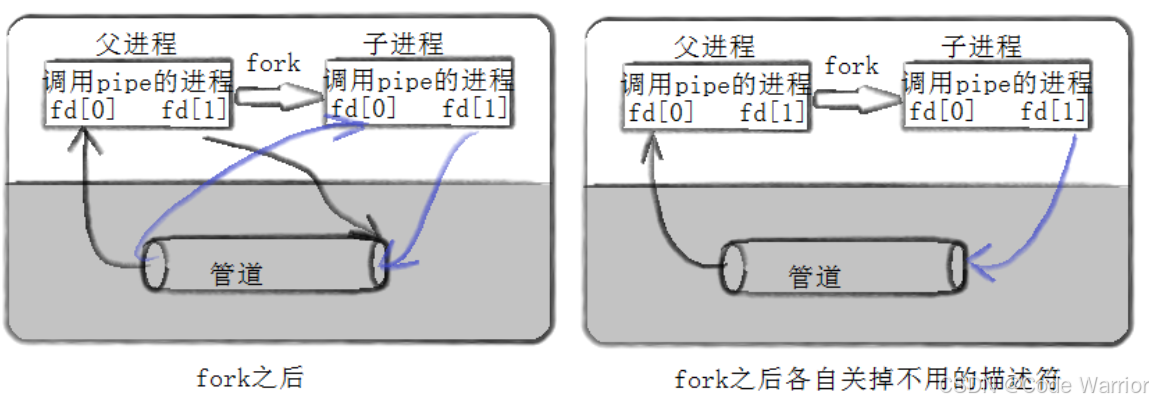,指向同一内核缓冲区; - 父进程和子进程通过关闭 “不需要的端” 实现单向通信(如父进程关闭读端