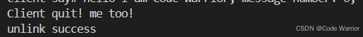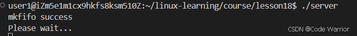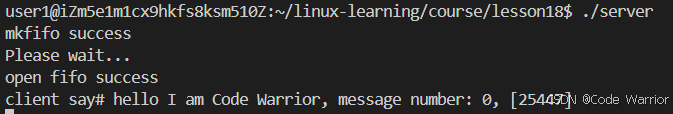 {// 创建管道文件umask(0);int n = mkfifo(FIFO_FILE, 0666);if (n < 0) {std::cerr << "mkfifo error" << std::endl;return 1;}std::cout << "mkfifo success" << std::endl;// 打开管道文件std::cout << "Please wait..." << std::endl;int fd = open(FIFO_FILE, O_RDONLY);if(fd < 0){std::cerr << "open fifo error" << std::endl;return 2;}std::cout << "open fifo success" << std::endl;// 正常的 readwhile(true){char buf[1024];int num = read(fd, buf, sizeof(buf) - 1);if(num > 0){buf[num] = 0;std::cout << "client say# " << buf << std::endl;}else if(num == 0){std::cout << "Client quit! me too!" << std::endl;break;}else{std::cout << "read error" << std::endl;break;}}close(fd);// 删除管道文件n = unlink(FIFO_FILE);if (n < 0) {std::cerr << "unlink error" << std::endl;return 1;}std::cout << "unlink success" << std::endl;return 0;