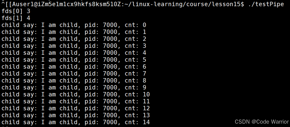 {char buffer[1024];int cnt = 0;while (true){snprintf(buffer, sizeof(buffer), "I am child, pid: %d, cnt: %d", getpid(), cnt++);write(wfd, buffer, strlen(buffer));sleep(1);}