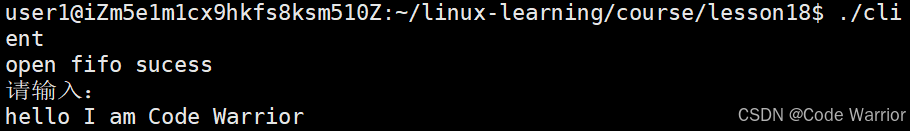 {// writeint fd = open(FIFO_FILE, O_WRONLY);if (fd < 0){std::cerr << "open fifo error" << std::endl;}std::cout << "open fifo sucess" << std::endl;// 写std::string message;int cnt = 0;pid_t id = getpid();while (true){std::cout << "请输入:" << std::endl;std::getline(std::cin, message);message += (", message number: " + std::to_string(cnt++) + ", [" + std::to_string(id) + "]");write(fd, message.c_str(), message.size());}return 0;