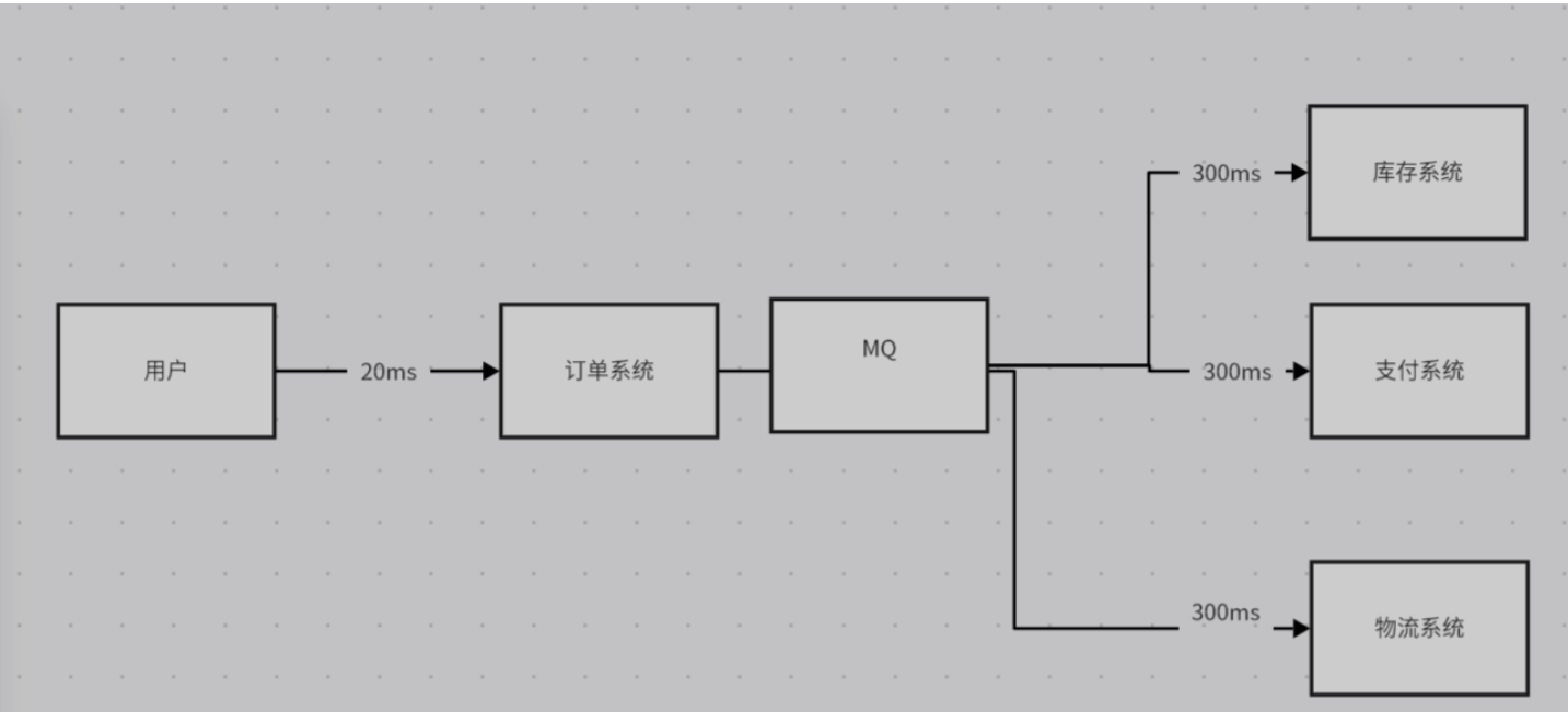同步:如果同步调用的话走完整个流程需要20+300+300+300=620ms