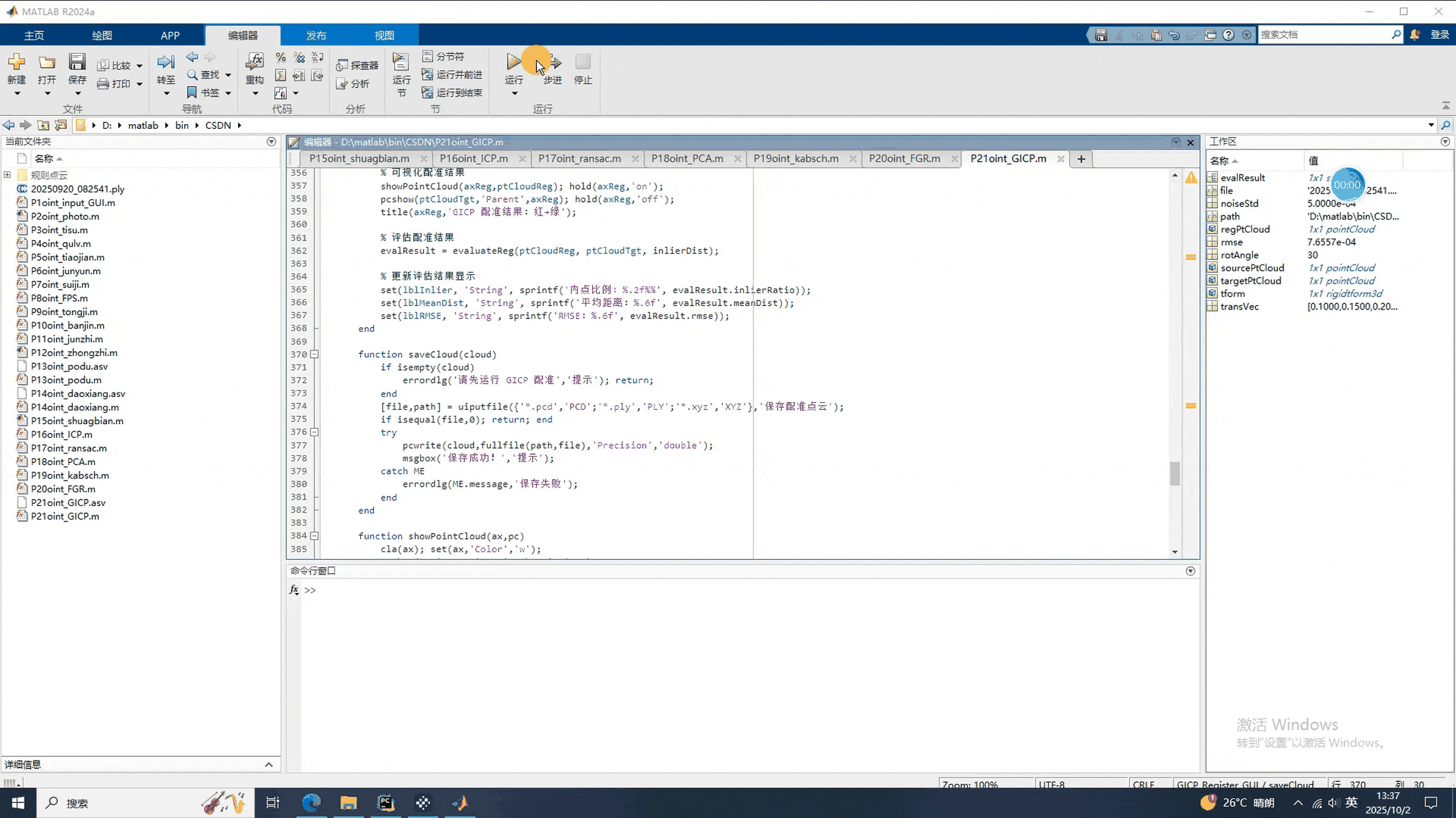 本节分享的是使用Matlab进行点云的GICP配准。GICP(Generalized Iterative Closest Point,广义迭代最近点)是 ICP 算法的改进版本,核心优势在于引入高斯混合模型(GMM)描述点云分布,并通过最大化两点云间的概率相似度实现配准,而非仅依赖 “最近点距离最小化”。相比传统 ICP,GICP 具有: