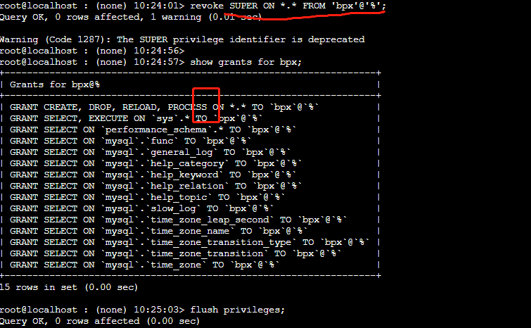 revoke SUPER ON *.* FROM 'bpx'@'%';
