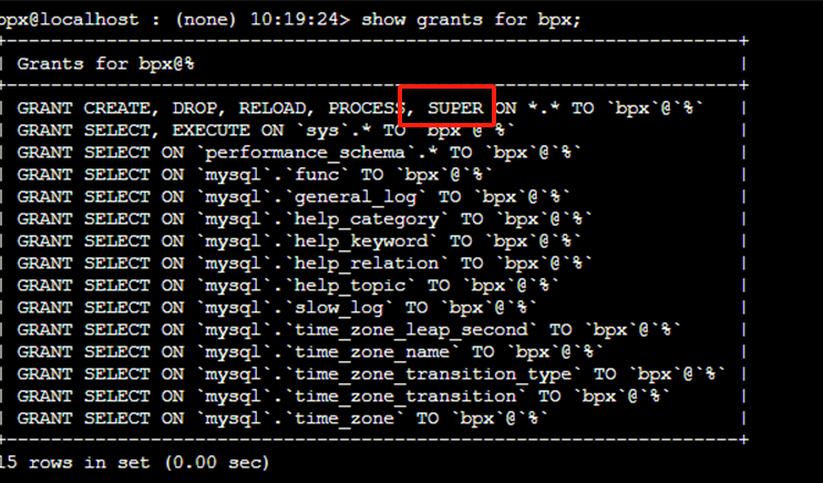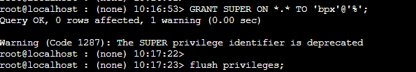 GRANT SUPER ON *.* TO 'bpx'@'%';