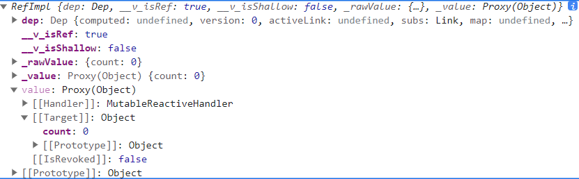 对象类型作为ref()的参数,则返回的对象是RefImpl(即为响应式对象),该对象的value属性才是{count:0}对象,因此访问该对象的count属性时需要通过.value.count来访问。