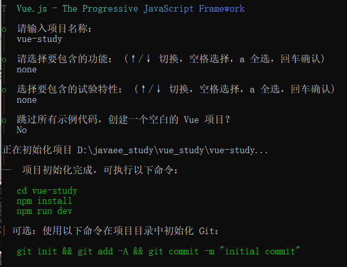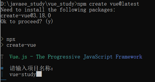 这一指令将会安装并执行 create-vue,它是 Vue 官方的项目脚手架工具。你将会看到一些诸如 TypeScript 和测试支持之类的可选功能提示: