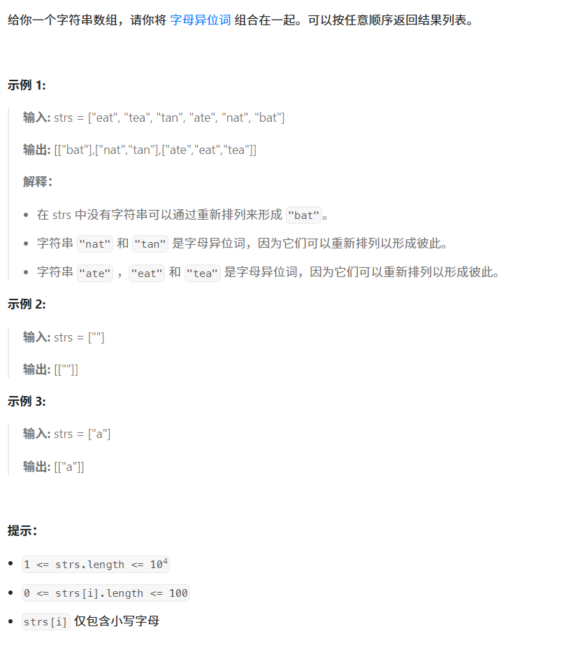 class Solution {public List<List<String>> groupAnagrams(String[] strs) {Map<String, List<String>> map = new HashMap();for (int i = 0; i < strs.length; i++) {// 将当前str排序作为该字母异位词统一存入HashMap的keychar[] chars = strs[i].toCharArray();Arrays.sort(chars);String str = String.valueOf(chars);// 拿出原有key为str的List,没有就创建一个List<String> list = map.getOrDefault(str, new ArrayList());list.add(strs[i]); // 添加当前异位词到List中map.put(str, list); // 放回Map中}return new ArrayList(map.values());}