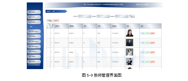 管理员点击教师管理;在教师管理页面对教师工号、教师姓名、性别、职称、联系电话、头像等信息,进行查询,新增或删除教师信息等操作;如图5-9所示。