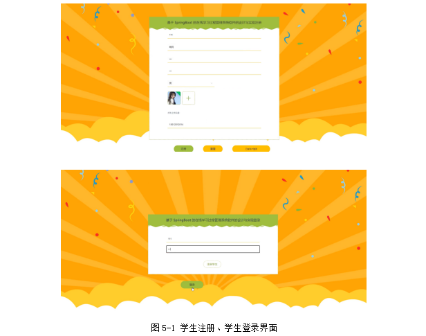 当学生进入前台系统进行相关操作前必须进行注册、登录,学生注册、学生登录界面如图5-1所示: