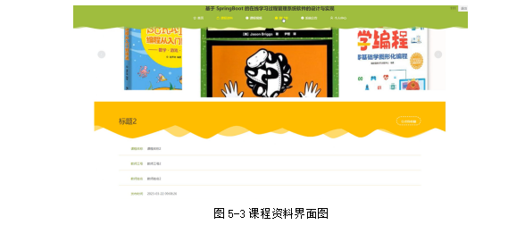 学生点击课程资料;在课程资料页面的搜索栏输入标题、课程名称、教师姓名,进行查询,然后可以查看标题、课程名称、图片、附件、教师工号、教师姓名、发布时间等信息,如有需要可以进行收藏等操作;如图5-3所示。