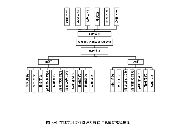 在线学习过程管理系统软件采用了结构化开发的方法。这种开发方法的优点是控制性比较强,开发过程中采用了结构化和模块化的设计思想,自顶向下,从总体到部分,合理划分系统的结构和模块[11]。结构化开发时使用模块式开发,各模块之间互不影响,方便系统的开发与管理。 网站总体功能如下图所示: