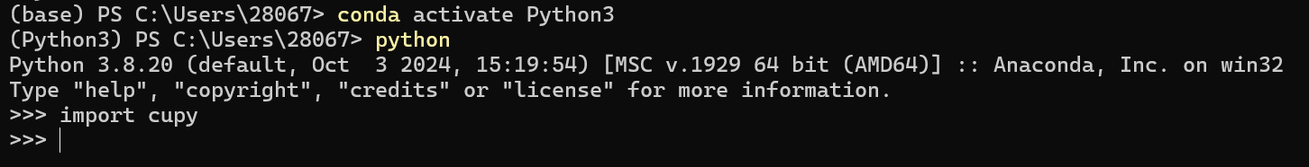 编写脚本文件或者是终端进去python模式,import cupy看是否会报错即可。