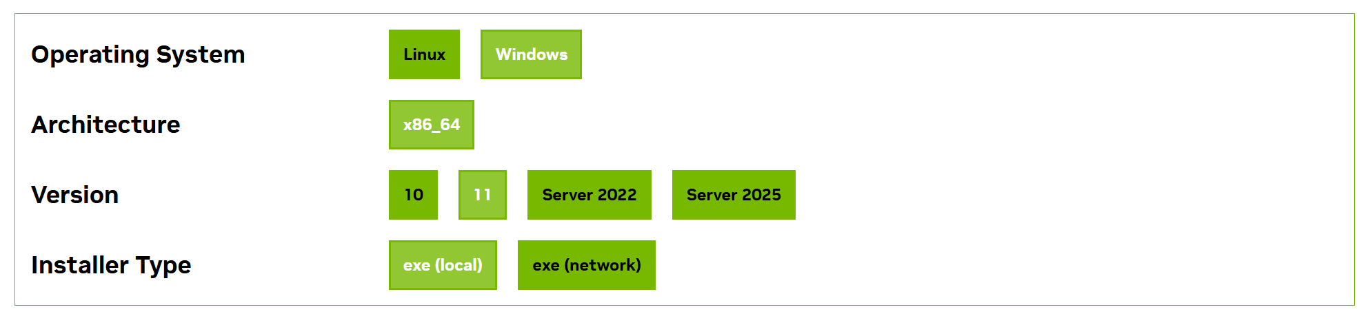 CUDA Toolkit 12.8 Downloads | NVIDIA Developerhttps://developer.nvidia.com/cuda-12-8-0-download-archive?target_os=Windows&target_arch=x86_64&target_version=11&target_type=exe_local此外,cuda工具包的配置根据电脑来选择即可,本人win11电脑配置如下: