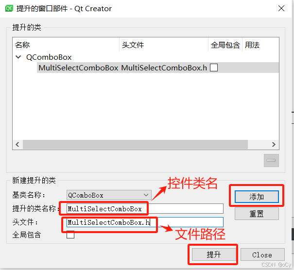 在mainwindow.ui的UI界面中,添加一个combobox控件,打开控件的右键菜单,选择“提升为...”,会弹出以下的对话框:
