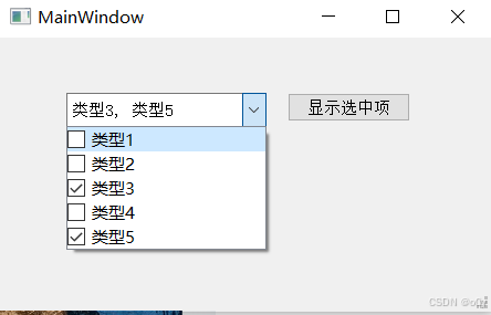 {ui->setupUi(this);ui->comboBox->addItem("类型1");ui->comboBox->addItem("类型2");ui->comboBox->addItem("类型3");ui->comboBox->addItem("类型4");ui->comboBox->addItem("类型5");QObject::connect(ui->pushButton, &QPushButton::clicked, [this](){qDebug() << "Selected:" << ui->comboBox->selectedItems();QMessageBox::information(this, "提示框", ui->comboBox->selectedItems().join(", "));});//连接信号---这里获取到当前最新的选项connect(ui->comboBox, &MultiSelectComboBox::itemCheckedStateChanged, [](const QStringList& selectpro) {for (const auto &item : selectpro) {qDebug() << "select:" << item;}qDebug() << "=====" ;});