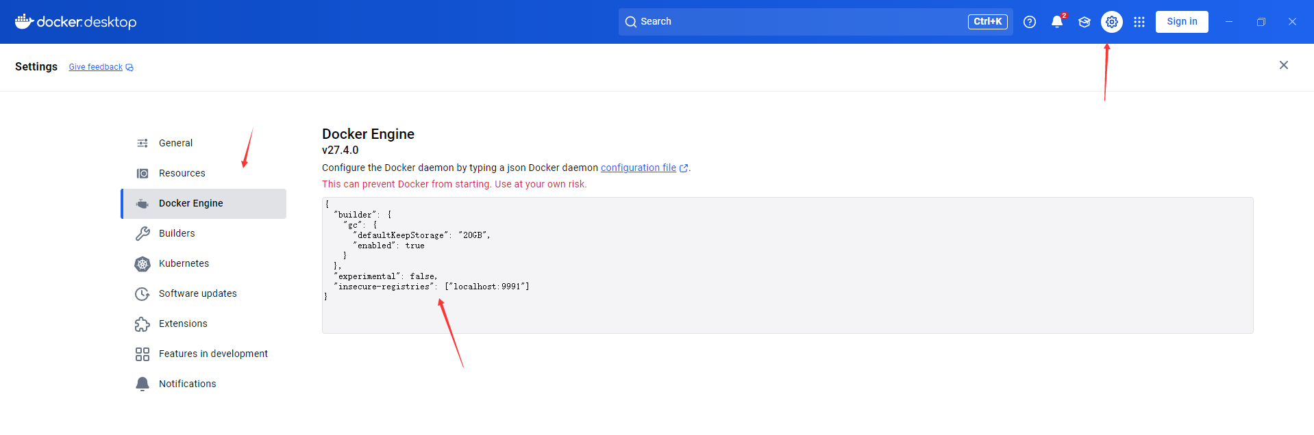 必须使用docker desktop里的settings->docker engine里列出的daemon.json图形界面来修改