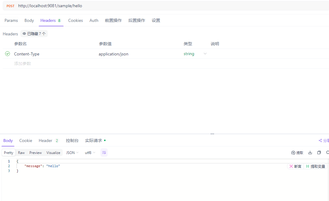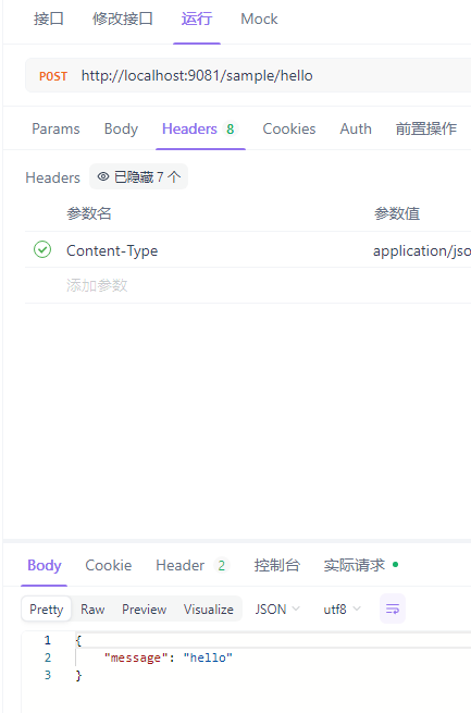 public class HelloApi {@PostMapping("/hello")@ResponseBodypublic String sayHello() {return "{\"message\": \"hello\"}";}