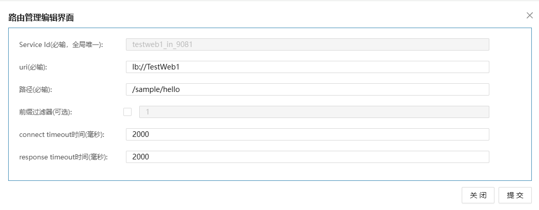 比如说:我们的TestWeb1上有一个服务:http://localhost:9081/sample/hello。只要按照上述这样的架构把TestWeb1做成镜像包放于docker中,我们只需要在spring cloud api gateway上配置成: