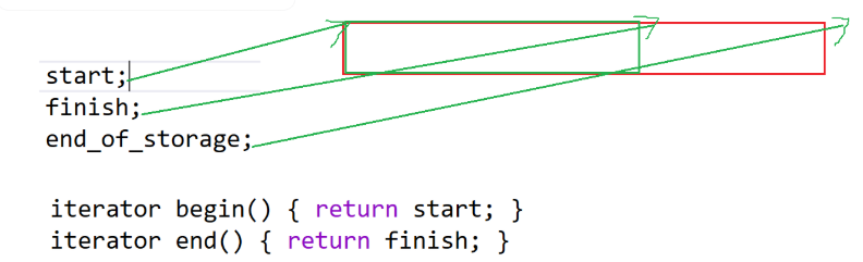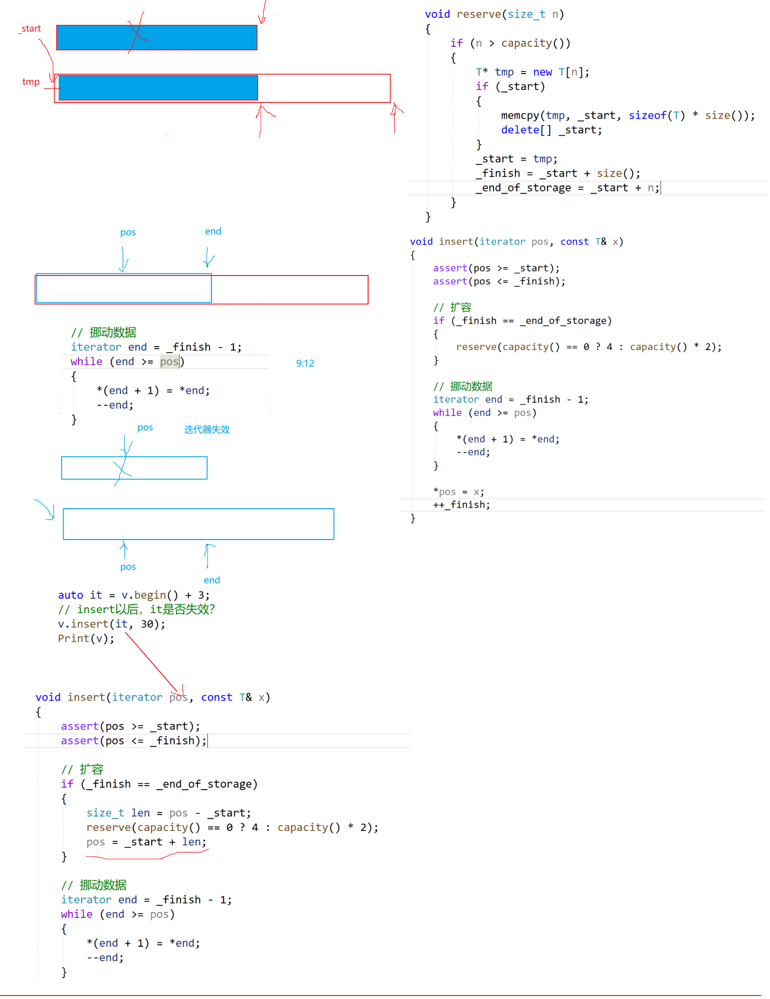 {template<class T>class vector{public:/*typedef T* iterator;*/using iterator = T*;using const_iterator = const T*;//using这里是复用了展开命名空间的关键词,关键词复用在C++很常见//迭代器iterator begin(){return _start;}//迭代器iterator end(){return _finish;}//const修饰的情况const_iterator begin() const{return _start;}//const修饰的情况const_iterator end() const{return _finish;}//构造vector():_start(nullptr),_finish(nullptr),_end_of_storqge(nullptr){ }//析构~vector(){if (_start){delete[] _start;_start = _finish = _end_of_storge = nullptr;}}//boolbool empty() const{return _start == _finish;}//扩容void reserve(size_t n){if (n > capacity())//这里是调用capacity的函数{size_t sz = size();//记录size的值T* tmp = new T[n];if (_start){memcpy(tmp, _start, sizeof(T) * sz);delete[] _start;}_start = tmp;_finish = _start + sz;//这里加size会出问题_end_of_storqge = _start + n;}}//容量size_t capacity() const{return _end_of_storge - _start;}//有效长度size_t size() const{return _finish - _start;}T& operator[](size_t i){assert(i < size());return _start[i];}const T& operator[](size_t i) const{assert(i < size());return _start[i];}void push_back(const T& x){if (_finish == _end_of_storge){reserve(capacity() == 0 ? 4 : capacity() * 2);//扩两倍}*_finish = x;++_finish;}void pop_back(){assert(!empty());//判空--_finish;}iterator insert(iterator pos, const T& x){assert(pos >= _start);assert(pos <= _finish);if (_finish == _end_of_storage){size_t len = pos - _start;reserve(capacity() == 0 ? 4 : capacity() * 2);pos = _start + len;}iterator end = _finish - 1;while (end >= pos){*(end + 1) = *end;--end;}//如果是malloc,这里就不能这么写了*pos = x;++_finish;return pos;}iterator erase(iterator pos){assert(pos >= _start);assert(pos < _finish);iterator it = pos + 1;while (it != _finish){*(it - 1) = *it;++it;}--_finish;return pos;}private:iterator _start;iterator _finish;iterator _end_of_storage;};
