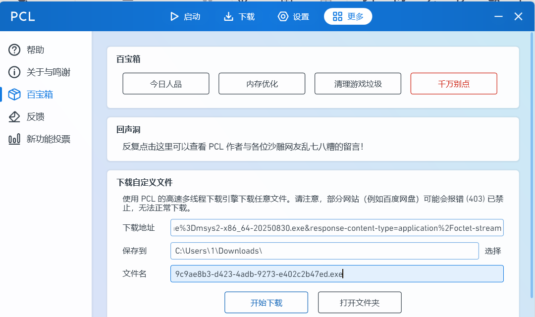 不过,因为网站是国外的,可能因延迟过高无法正常访问,建议大家使用加速器或者多线程下载器来加速下载。将msys2的安装包的下载链接复制可用于下载,因为我刚好下载了PCL2启动器,就直接用这个了