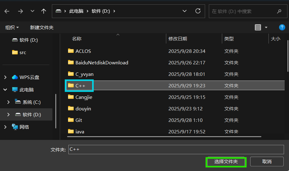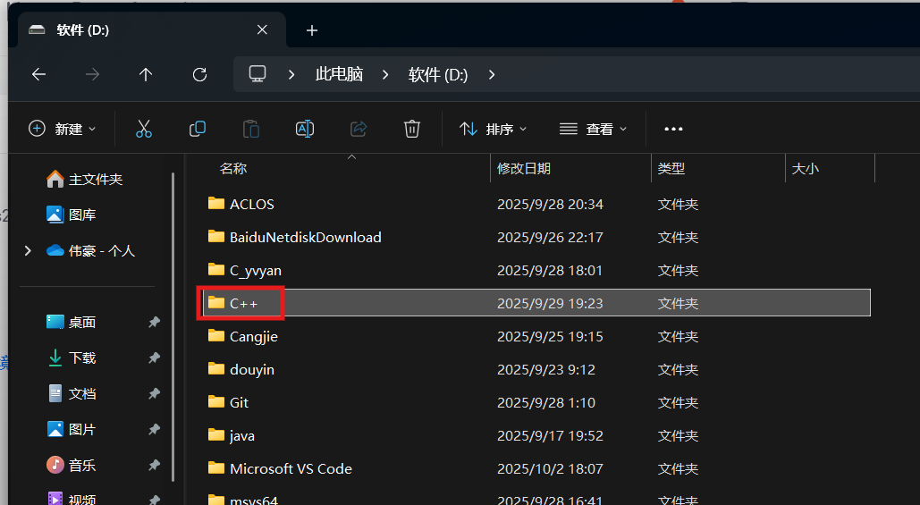 在D盘中新建文件夹:C++